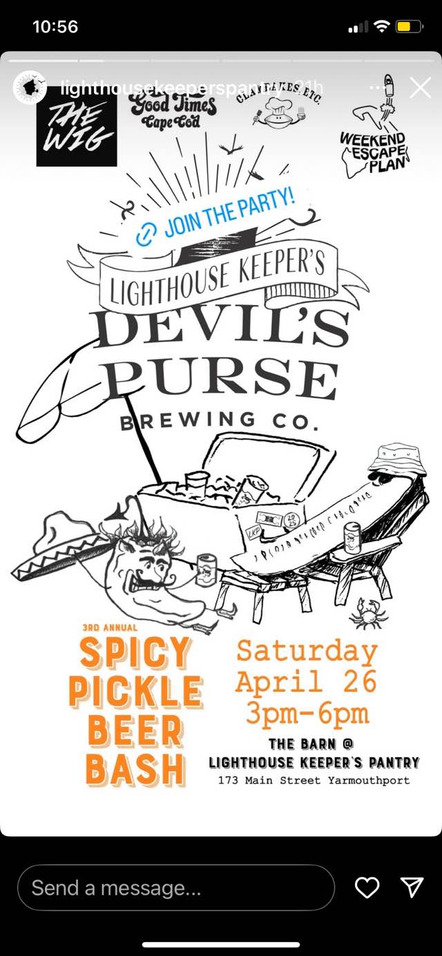 Come join us at the Lighthouse Keeper’s Pantry for our 3rd annual Spicy Pickle Beer Bash celebrating the limited release of Our Spicy Pickle Lager from Devil’s Purse Brewing Co. An afternoon filled with delicious gourmet eats, raw bar and craft lagers from our friends at Devil’s Purse Brewing Co. Whether you’re a beer connoisseur or a pickle enthusiast, this event is sure to satisfy your cravings. Enjoy music from The Wig’s Weekend Escape Plan, Ice cream from Good Times Cape Cod, and good company in the Barn at Lighthouse Keeper’s Pantry.